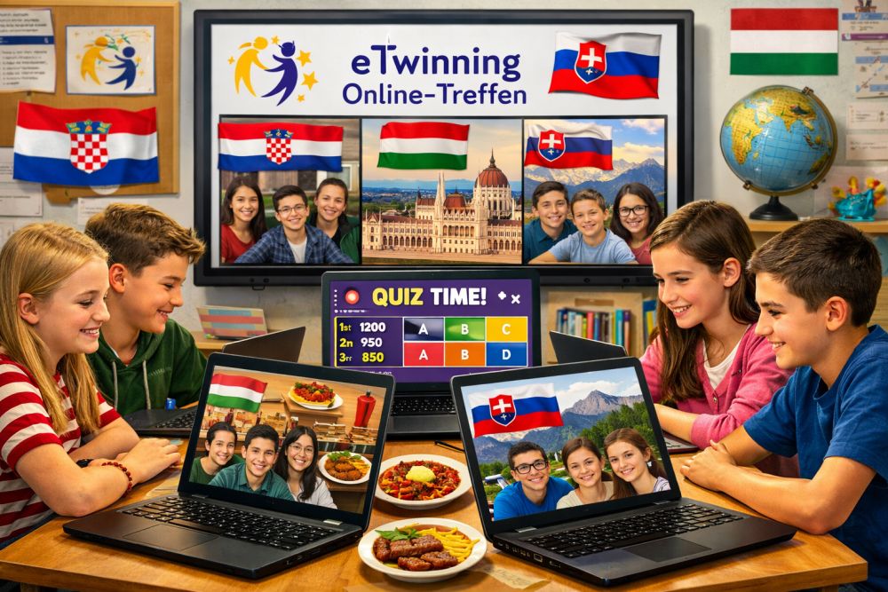 Heute haben die Sechst- und Achtklässler unserer Schule im Rahmen des eTwinning-Projekts (Bildungsplattform der Europäischen Union) an einem Online-Treffen teilgenommen. Der Titel des Projekts lautet: „Deutsch im Brief“, sechs Pädagogen und mehr als 60 Schüler nehmen daran teil. Unsere Partner bei diesem Treffen waren kroatische und slowakische Schüler. Wir haben einander unsere Schulen, unsere Essgewohnheiten und unsere Nationalgerichte vorgestellt. Das Treffen fand natürlich auf Deutsch statt. Nach den Vorstellungen haben wir das Treffen mit einem gemeinsamen Online-Spiel abgeschlossen. Dies war nur eines der mehreren eTwinning-Projekte, an denen die Schüler unserer Schule in diesem Schuljahr teilnehmen.
