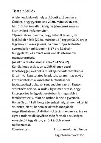 A jelenleg kialakult helyzet következtében kérem Önöket, hogy gyermekeik 2020. március 16-ától, hétfőtől határozatlan ideig ne jelenjenek meg az köznevelési intézményben.