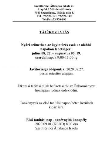 Nyári szünetben az ügyintézés csak az alábbi napokon lehetséges: